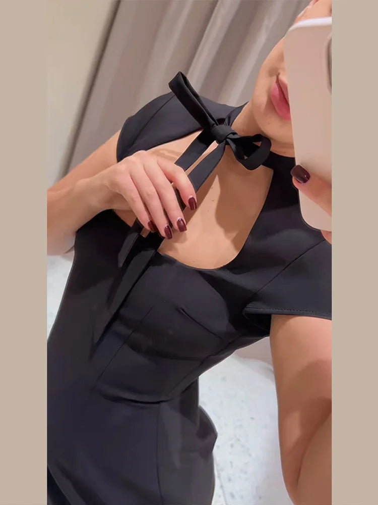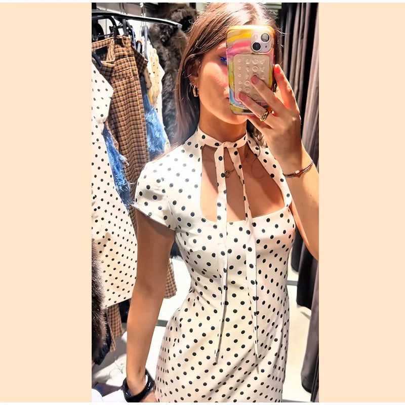 Fashion Polka Dot Mini Dress For Women Elegant Bow Tie Neck Short Sleeve Waist Slim Dress Lady 2026 Spring Summer Chic Vestidos