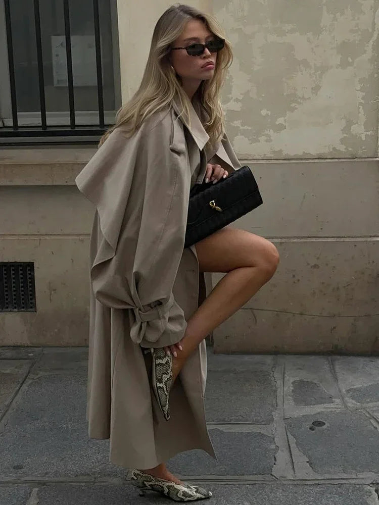 Solid Lace Up Long Trench Coat Women Chic Full Sleeves Lapel Single Breasted Loose Outerwear 2026 Lady Spring High Street Wear