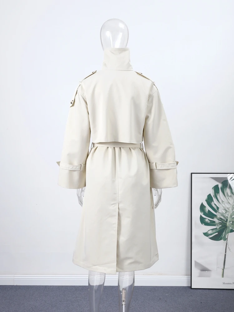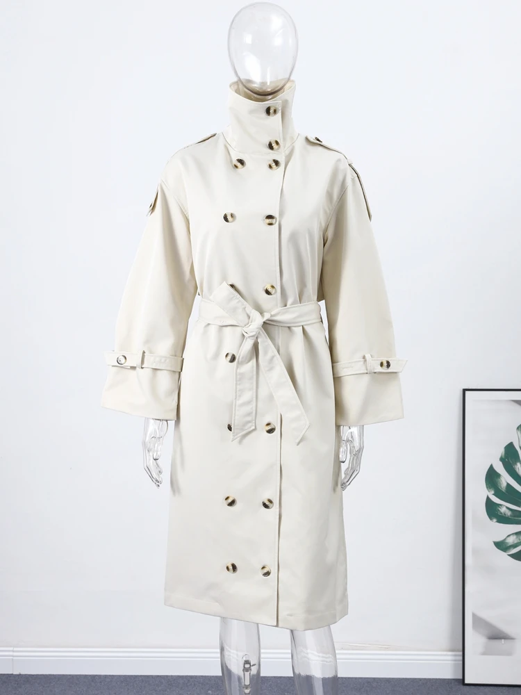 Women's Trench Coat Double Breasted Stand Collar Epaulet Lace Up Long Windbreaker Office Lady Autumn Winter Solid Slim Outerwear